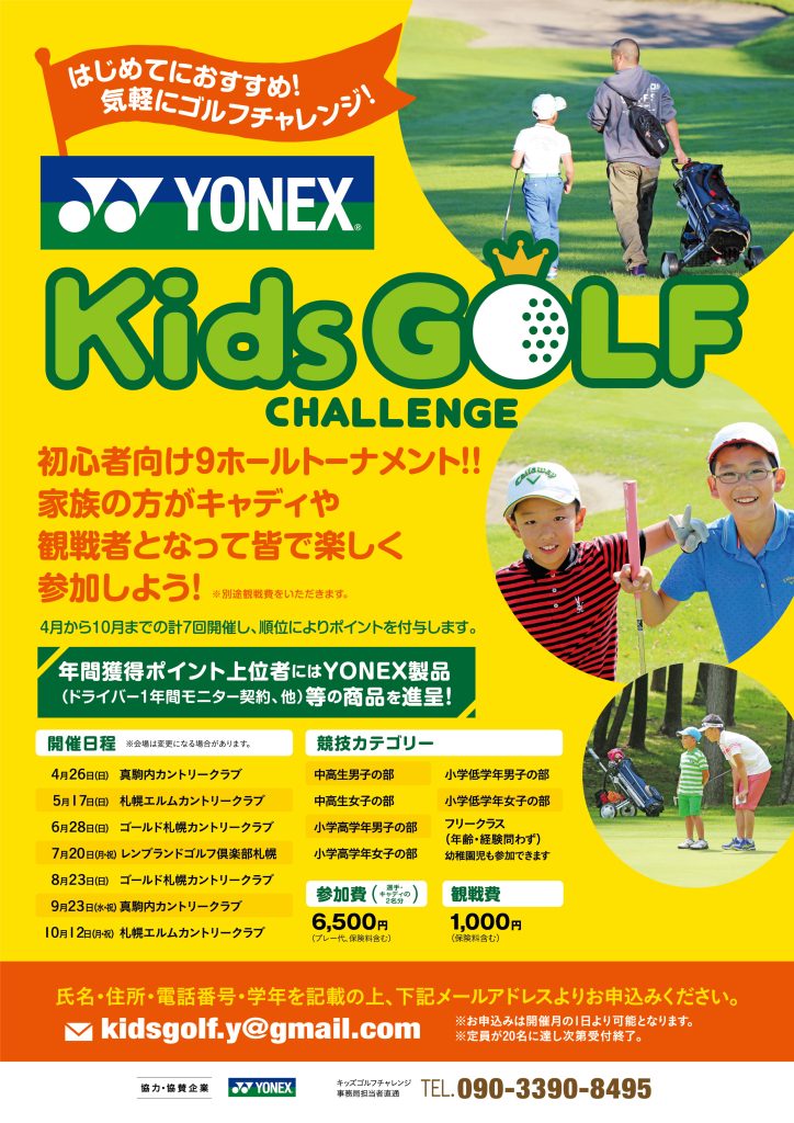 | 申込先 | キッズゴルフチャレンジ事務局 kidsgolf.y@gmail.com ※氏名・住所・電話番号・学年を記載の上、上記メールアドレスより申込みください。 |