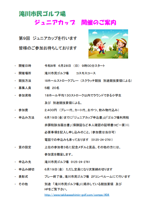 | 申込先 | 滝川市民ゴルフ場 (TEL:0125-24-2761) |